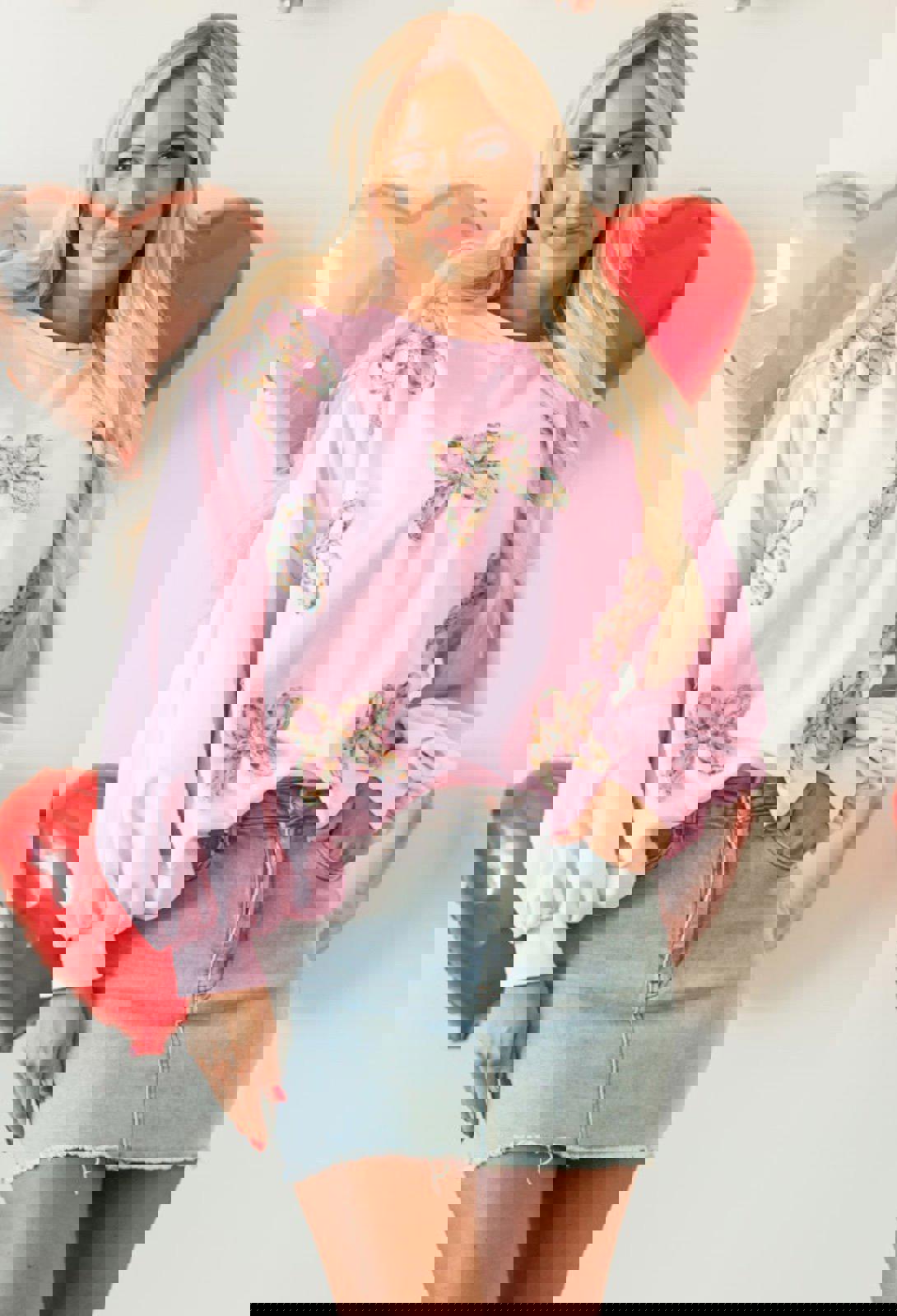 Light Pink Embroidered Bow Lantern Sleeve Oversized Pullover Sweatshirt